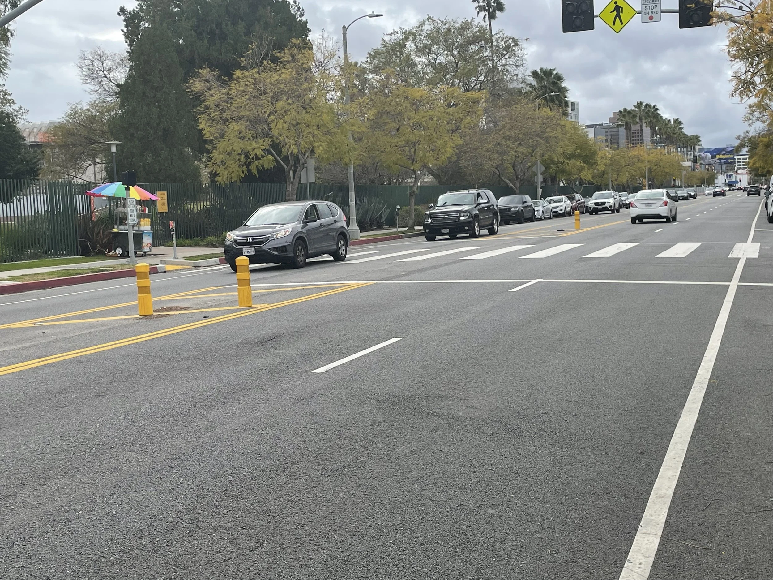 When the HAWK signal crosswalk was installed in 2019, it was safety-challenged from the get-go. It lacked eye level signage and nothing to stop drivers from barreling down the restricted center lane when they got frustrated with the slow moving through lane. When PLBIRG reported the danger, LADOT installed a set of six plastic bollards in the center lane although we had asked for a concrete island with eye level signage. Within six months half of the bollards had been demolished by cars—showing just how vulnerable pedestrians crossing here were. In 2023 PLBIRG mounted a new campaign to achieve a truly safe crosswalk, which this time was embraced by a responsive LADOT staff. In November 2024, the upgraded crosswalk (see photo) debuted with a concrete refuge and high visibility eye-level signage. What’s more, LADOT heeded our request to program the signal to change the red on a fixed cycle without the need for a pedestrian to activate it.[3-15-25 UPDATE: AFTER RECENT RAINS THIS FEATURE WAS DEACTIVATED. WE ARE WORKING TO HAVE IT REINSTATED.]