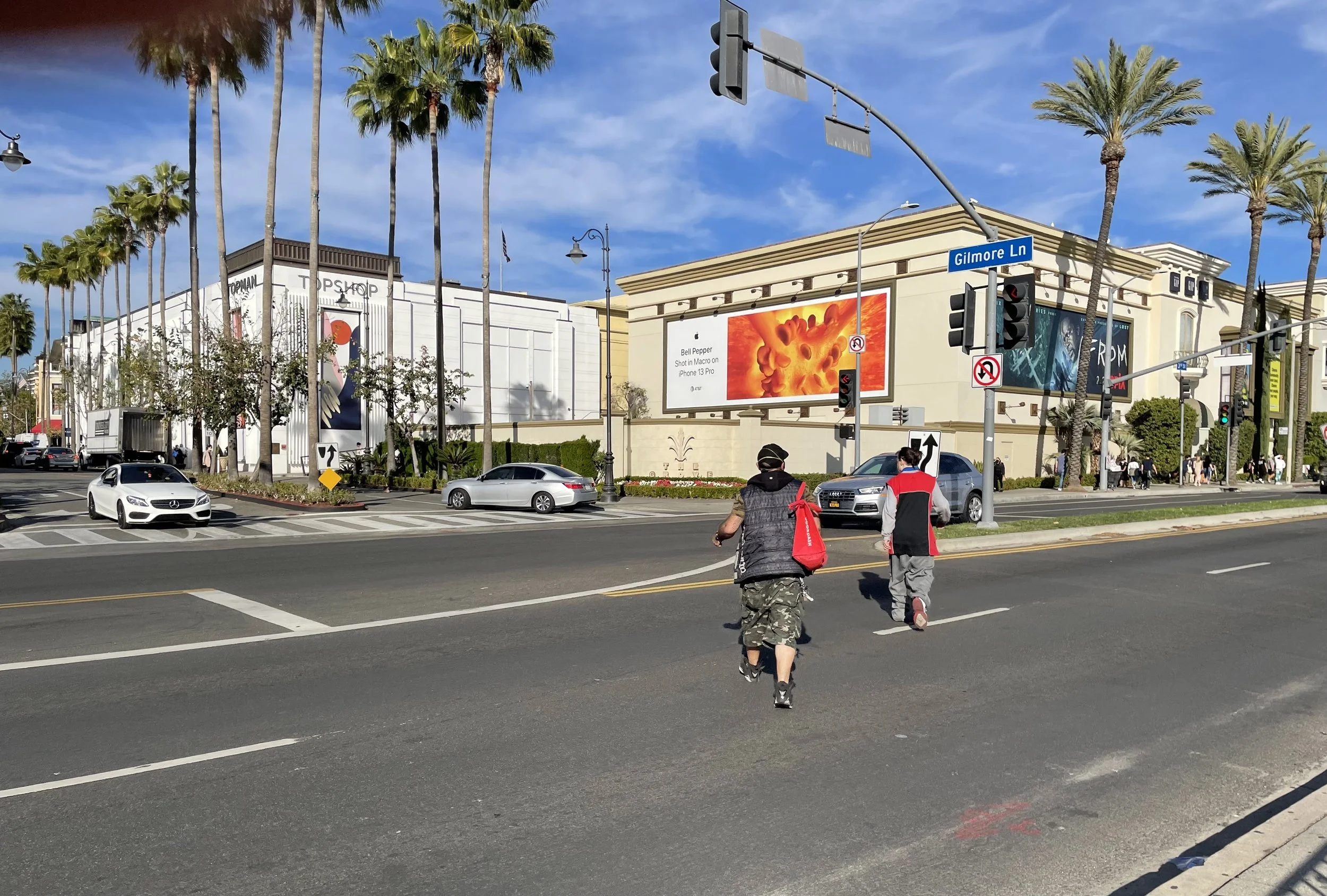 Fairfax Avenue looking east just south of Blackburn. A resident crosses from driveway to driveway after visiting Whole Foods Market. The nearest crosswalk is 250’ to the north, at 3rd St., which makes for a 500’ roundtrip just to cross the street.