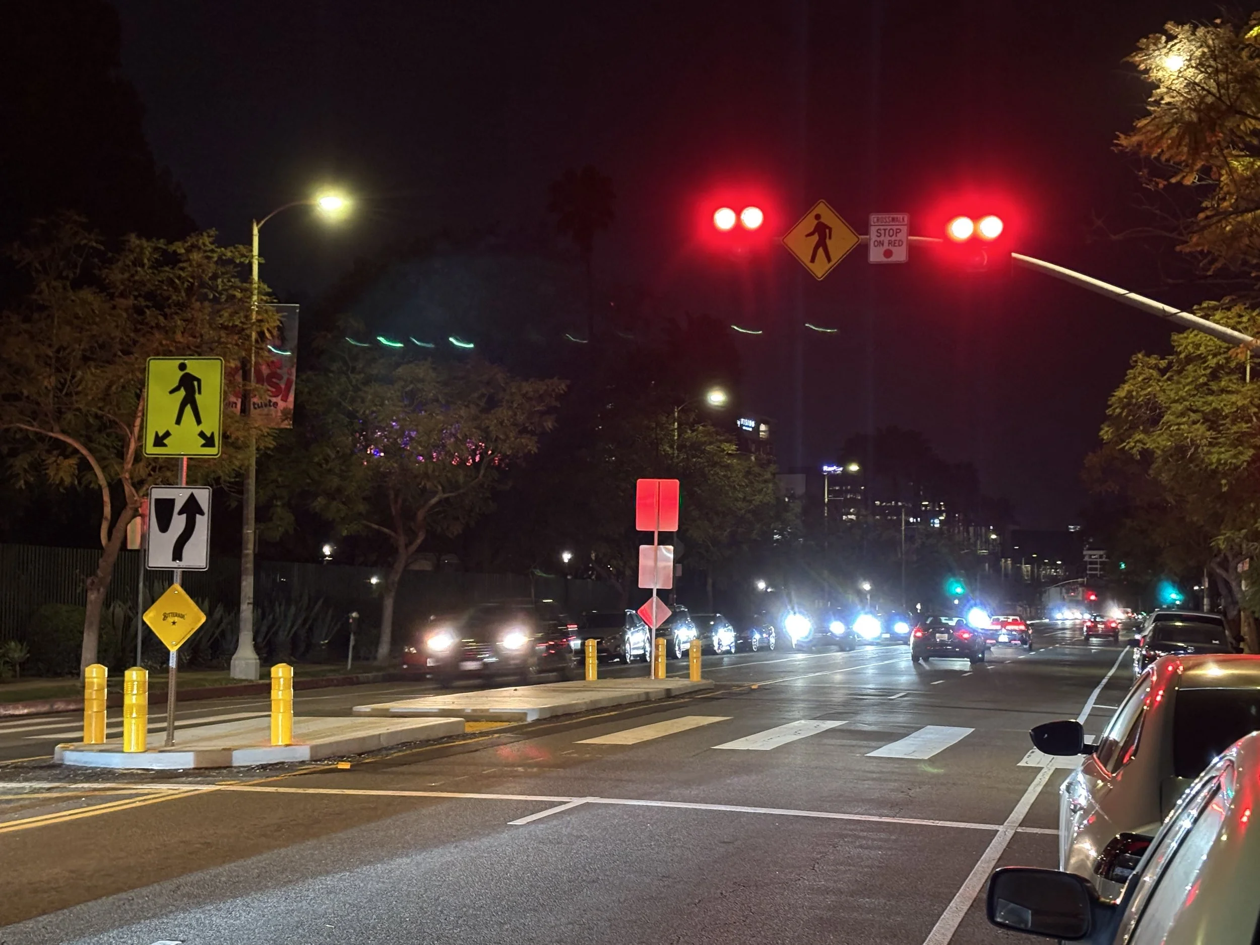 At left: In response to PLBIRG’s advocacy, in Nov. 2024, LADOT installed this concrete island and eye level signage to enhance pedestrian safety going to and from the Museum campus. LADOT also obliged PLBIRG’s request for the signal to go on and off in a programmed cycle even when no person activates it. This is an important safety feature because some drivers don’t come to a full stop at this crossing. The perpetual cycling of the red light serves to slow traffic down for better visibility of pedestrians in the crosswalk.